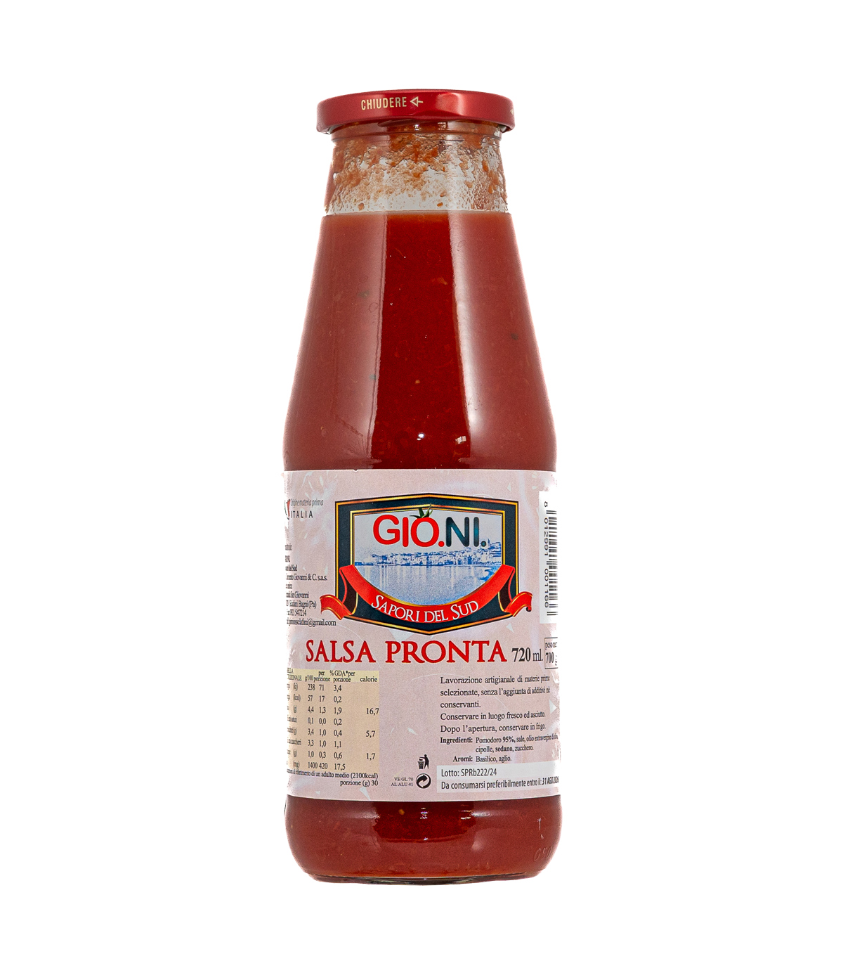 La Salsa Pronta di Pomodoro Gioni è una specialità artigianale siciliana preparata con pomodori maturati al sole, selezionati con cura per offrire un gusto autentico e ricco.